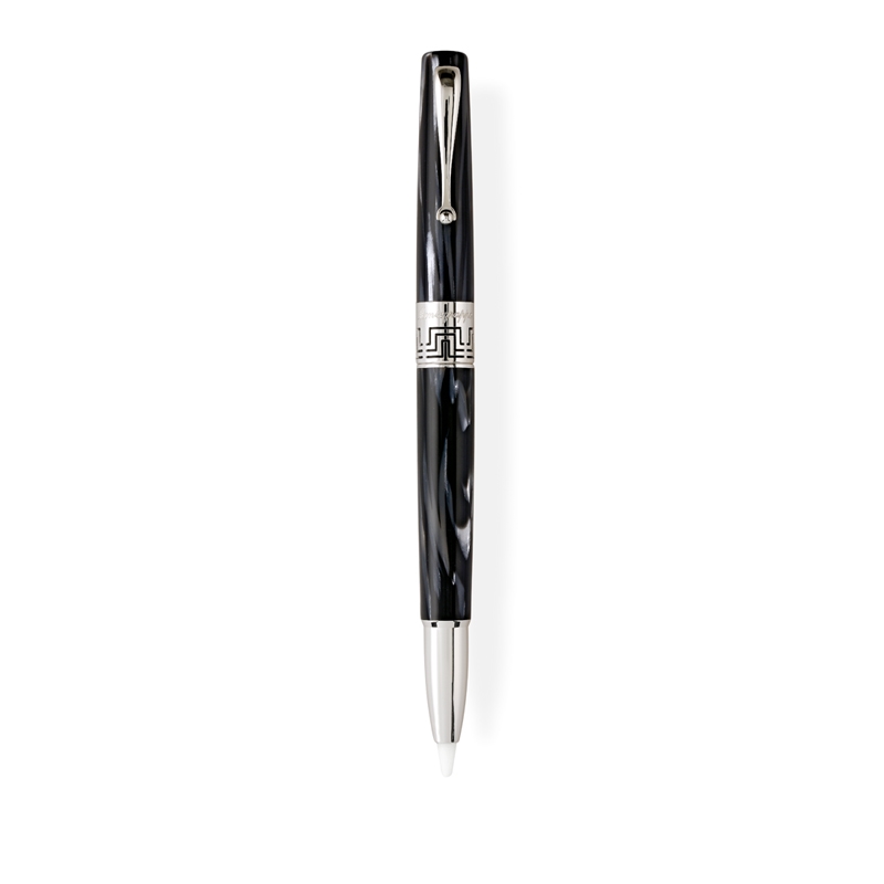 The new 2017 Extra APC1 is available in Black & White pearlised celluloid and Sterling Silver trim. A sleek and sinuous pocket clip is fitted with Montegrappa’s signature rotating sphere. The cut-out Greek motif onto the cap’s band recalls the Extra 1930.