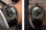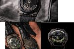 The first lies in the unusual composition of the alloy which results in a delicate patina. The bronze is then in the hands of a computer-controlled milling station that carves the pattern of scales on the top and sides of the case. The final processes, sand-blasting and Urwerk’s proprietary method of biochemical burnishing, give the watch its distinctive colour.