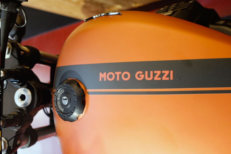 The special dedicated colour scheme, a brand new and gritty orange, covers the fuel tank – with the Moto Guzzi eagle done in a particular burnished finish – and also extends to the aluminium side panels, thereby mixing with the V9 Bobber’s typical matte total black look. The dark shades also spill over into other parts such as the engine cooling fins, the fuel cap in billet aluminium, the headlight frame and the instrument cluster graphics.