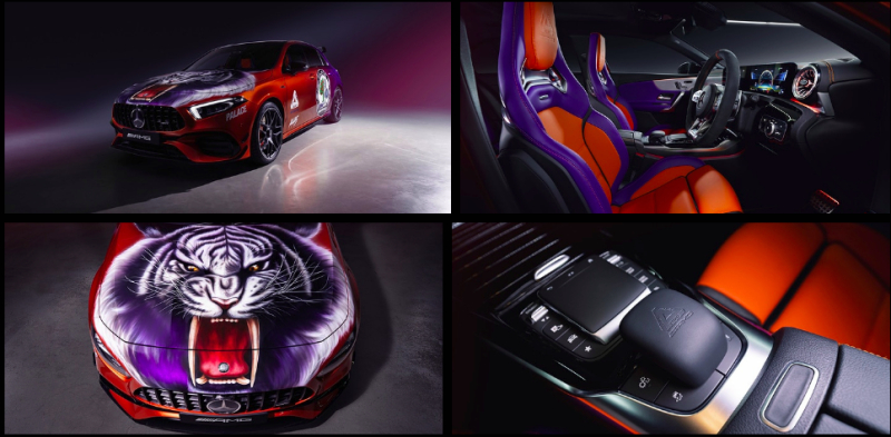 Mercedes‑AMG A 45 S PALACE Edition/”Tiger London”: The bold, multicolour paintwork, the large head of a white tiger on the bonnet and the large AMG emblem on the sides of the car pay homage to the vibrant and diverse custom car scene in the UK in the 1960s, 1970s and 1980s.
