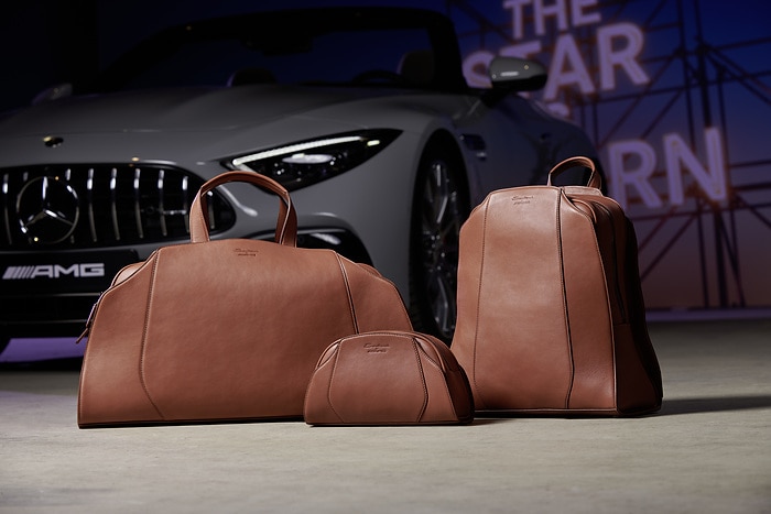 To coincide with the market launch of the new roadster, the Italian leather goods manufacturer Santoni is offering a luggage set that is tailor-made to fit the boot of the new Mercedes‑AMG SL from spring 2022. The collection includes a beauty case, a backpack and a weekender. All three products are made of high-quality nappa leather, and are available in three different colours. Mercedes-AMG and Santoni have been in close partnership for many years. As part of this successful lifestyle cooperation, the luxury goods manufacturer offers a wide range of exclusive shoes and accessories such as belts and wallets under the label “Santoni for AMG”.