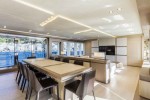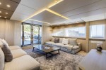 To reduce the mass of the hull structure from the side profile and offer uninterrupted views from the main salon, the bulwarks feature glass cut-outs that also serve as fold-down balconies. These are complemented by full-height glass doors, which were engineered by the Shipyard to either slide or hinge open. With the doors open and the balconies lowered, the salon becomes a floating terrace with singular sea views.