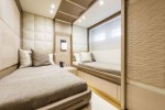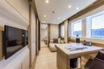 Three-decked aluminum M/Y Divine hosts ten guests in five staterooms with the owner’s suite and study on the main deck, and she can accommodates eight crew members.