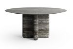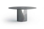 Andrej is a table with a sculptural presence, on which Elisa Ossino has introduced a highly prominent formal contrast between the volume of the base and the extremely thin top featuring a slightly rounded oval shape. The tension between the shape of the elliptical top and the solid mass of the base is echoed once again in the cross-plan base matched with workmanship that dramatically thins out the edges, making them resemble a leaf. Coordinated base and top in Marquina Black, Carrara White marble or Travertino Grey. Internal frame and under top in steel with matt black varnishing.