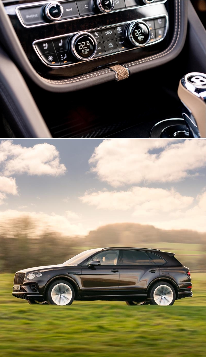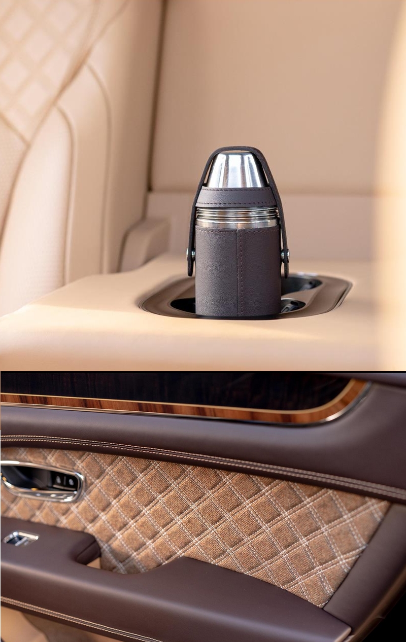 The Bentayga’s 22” ten spoke alloy wheels have been matched to the exterior paintwork and then diamond turned and polished to produce the final surface. On entry to the car, passengers will notice the LED Bentley Welcome lights, illuminated treadplates and tactile tweed surfaces. A bespoke accessory in the form of a Hunter Flask bound in matching leather to the interior has been commissioned for when away from the car.
