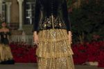 The emblematic Manila shawl meets Andalusian horsemen’s pants and short jackets adorned with brandebourg closures. Mantillas are elevated with exquisite embroidery, joined by men’s pinstripe suits and trimmed boleros. Shimmering taffeta in red, yellow, ocher and black is sculpted into exuberant skirts, while lace appears in manifold forms. The emblematic Dior Bar jacket is reinvented in black velvet embroidered with gold threads.