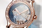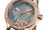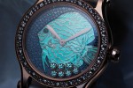 This watch vividly evoking the underwater world showcases artistic crafts applied to creating a poetically romantic effect. The textured mother-of-pearl and gold leaf fish swims gently amid an ocean of blue sapphires, appearing to make its way around seven moving diamonds.
