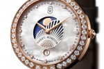 Whereas in the majority of moon-phase mechanisms, the moon disappears completely before beginning a new cycle, here the golden moon takes cover behind a delicate mother-of-pearl lattice, hidden but not completely out of sight.