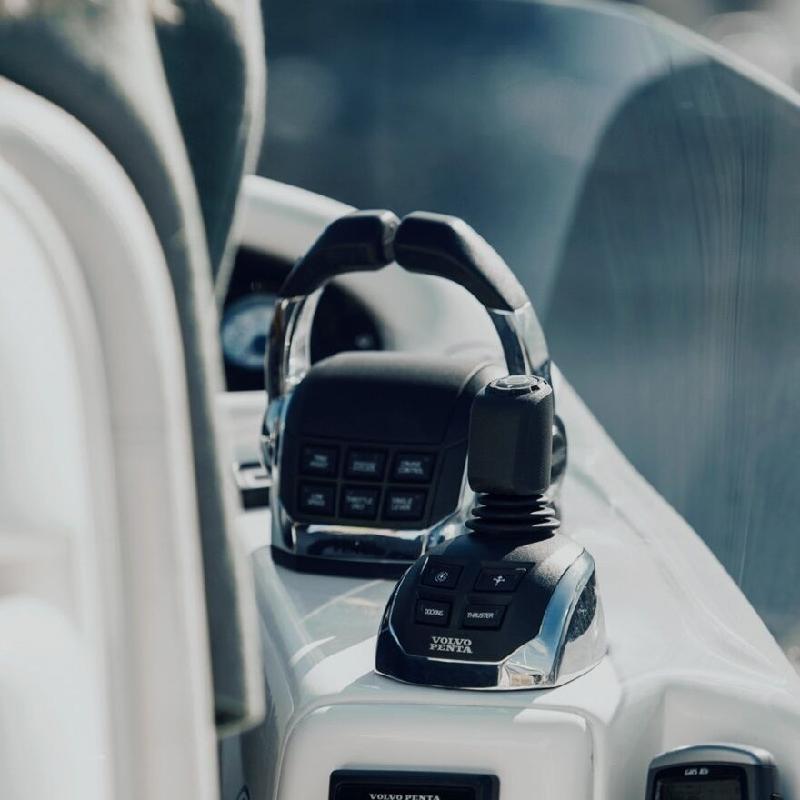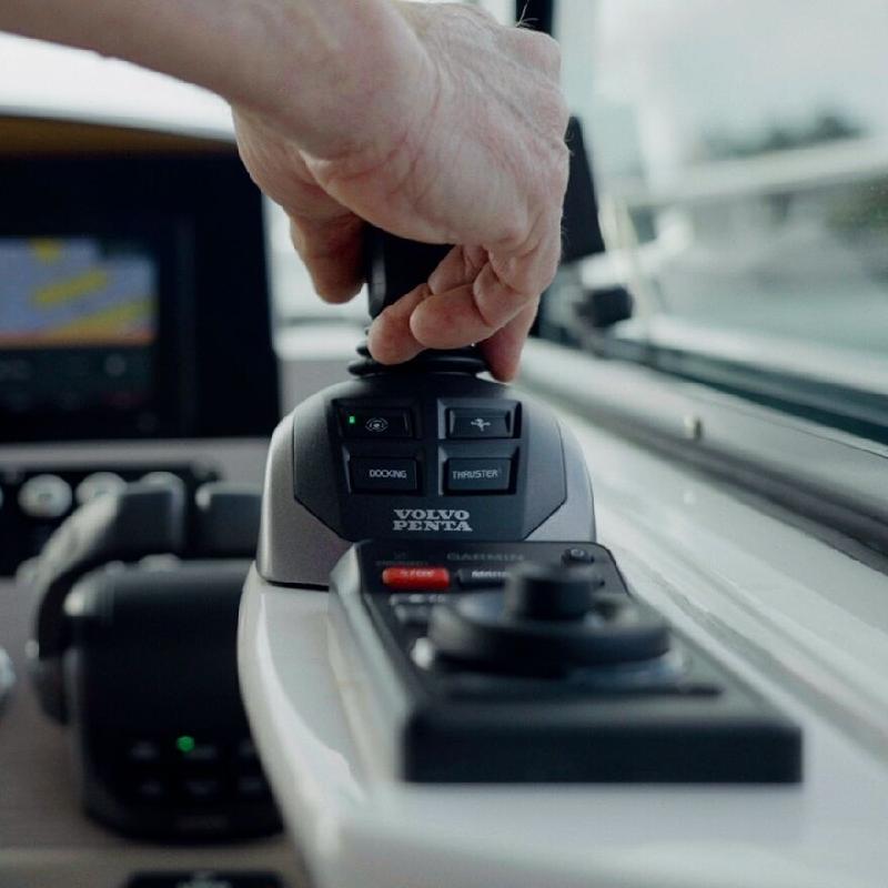 This new Volvo Penta Joystick Docking innovation offers the option to marry Joystick Control with the Volvo Penta Glass Cockpit system, which then integrates Volvo Penta Auto Pilot, all controlled with one joystick. This feature holds the boat’s speed and heading at the press of a button. The boat’s steering is then controlled easily and conveniently through the fingertip control of the Joystick.