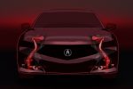 Teaser image hints at new Acura TLX’s expressive rear profile, wide stance, low roofline and quad exhaust outlets. The technical teaser image previews the TLX’s new chassis and double-wishbone front suspension.
