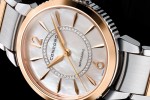 contrast between stainless steel, pink gold and shimmering white mother-of-pearl. The delicate diamond embellishment on the dial pays a shining tribute to the design’s aesthetic harmony.