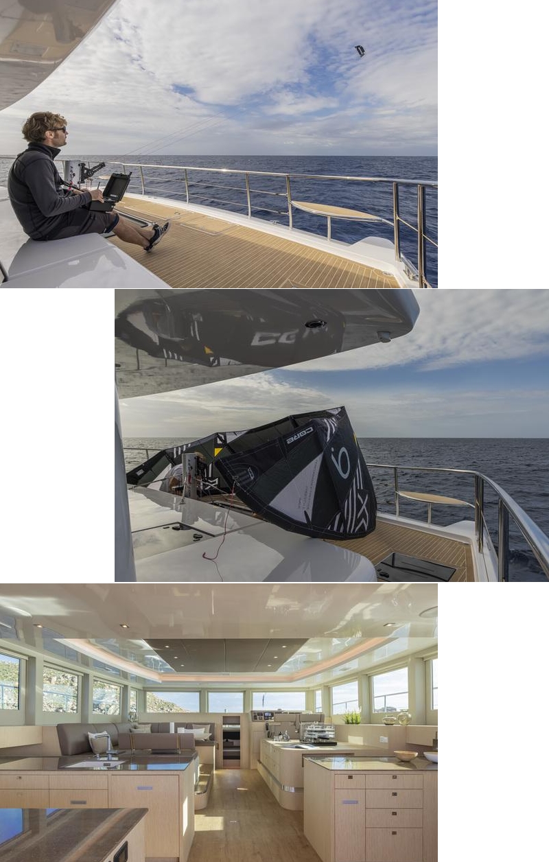 A dedicated storage locker under the foredeck houses the kite wing and all its components, including an electric winch and a short, collapsible mast. On the first unit the mast is connected by four shrouds to pad eyes on deck that distribute the forces through the hull structure, but on subsequent deliveries (8 units with the kite wing option have been ordered to date) the mast will be mounted on a baseplate inside the locker to leave the foredeck clutter-free.