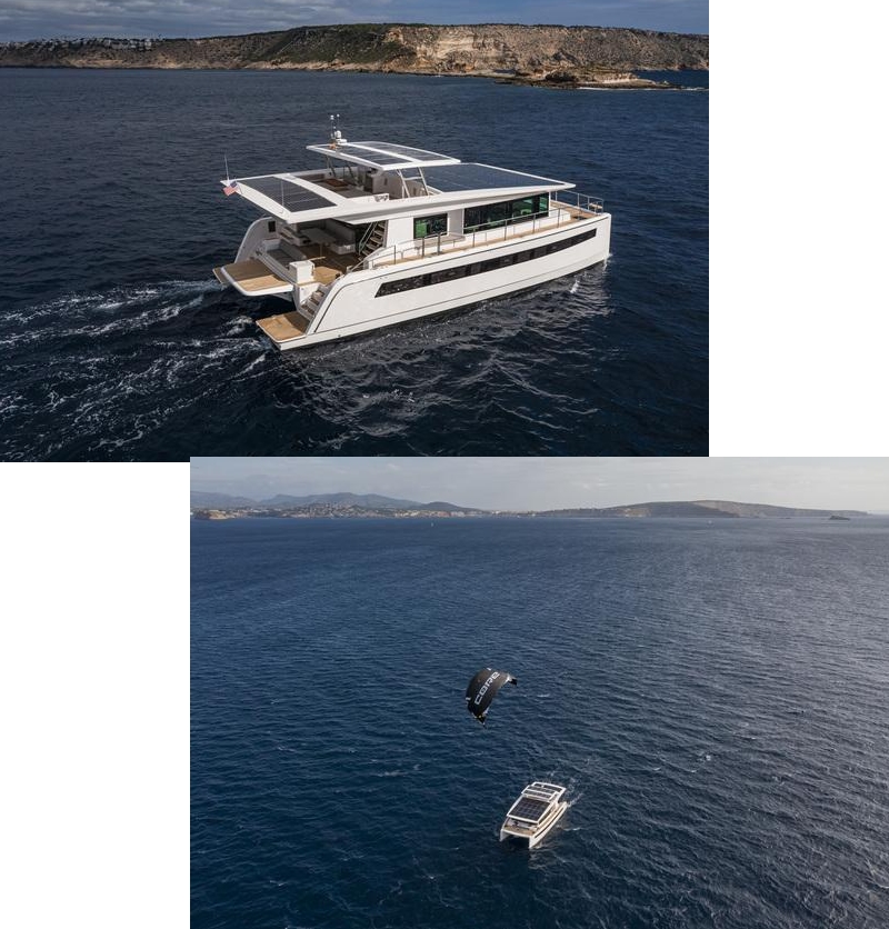 Discover the world’s most prestigious gatherings & exhibitionsThe new SILENT 60 solar powered catamaran carries 42 solar panels for 17 kWp of solar energy to power two electric motors of up to 2x340kw.Backed up by a battery capacity of up to 286 kWh, the yacht can cruise efficiently with zero emissions solely on solar power for up to 100 nautical miles a day for weeks.
