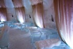 The Ice Hotel features 10 standard rooms and 15 prestige suites, including five igloos. Each room is adorned with a bed that sits on top of a base made entirely of ice. Thermal sleeping bags provide the extra comfort and coziness needed to withstand the chilly room temperature of 41 degrees Fahrenheit/5 degrees Celsius.