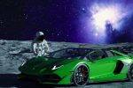 The Green Aventador SVJ Roadster on the moon with the Earth in the background and one astronaut is depicted in this first NFT for ‘The Epic Road Trip’ series.