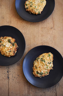 Tiny free-form omelettes the size of a large biscuit. Let them form their own shape in the pan. Eat them as they are, or with the simple dressing below.