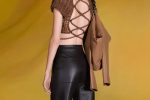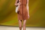 Delicate leather work is deployed in a palette of browns full of suppleness and breadth. The burning sunlight hits sequins in lambskin, graduated perforations, interplays of braiding and crochet, forming athletic and feminine pieces.