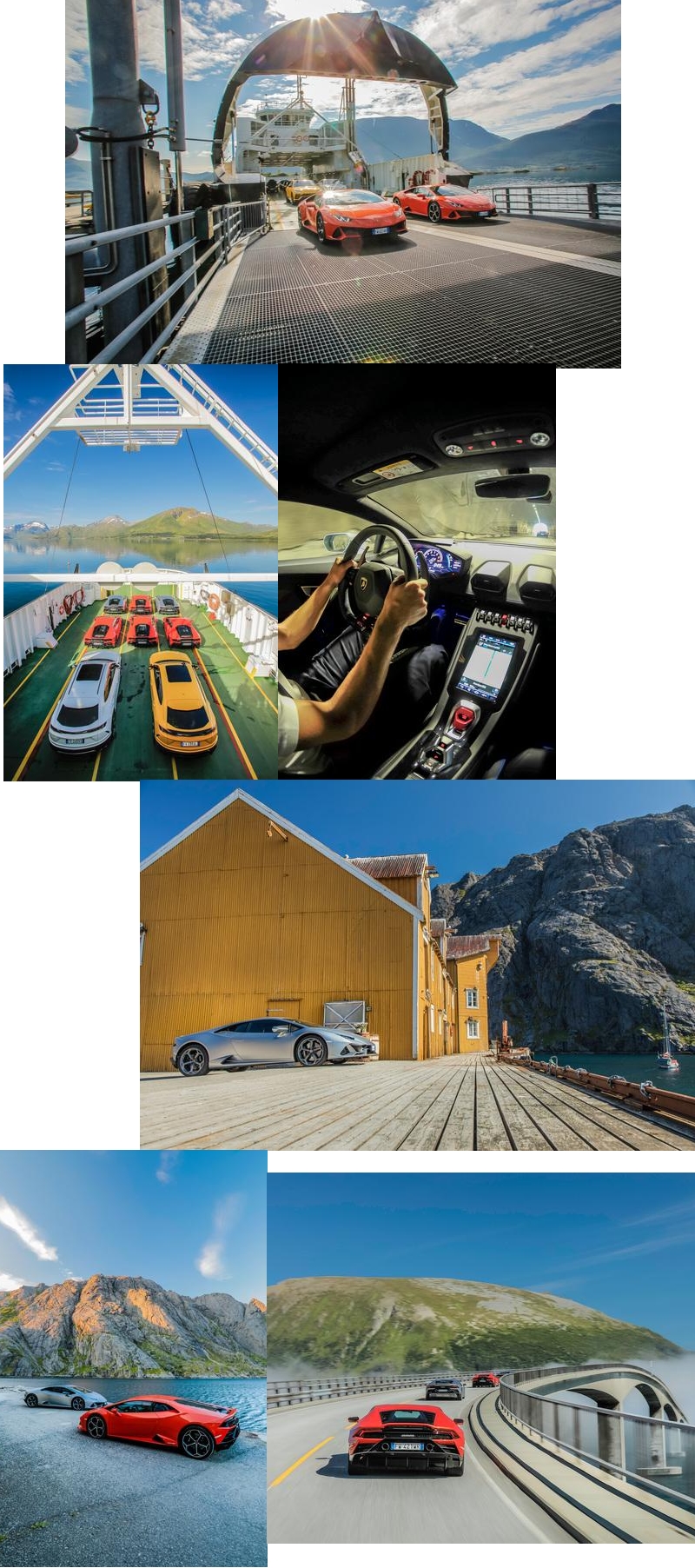 This incredible journey saw seven Lamborghinis traveling through an archipelago of islands connected by tunnels and roads that appear to float on water, with picturesque bridges, cliffs and mountains formed of the oldest rocks in Europe. This untouched landscape beyond the Arctic Circle, sculpted by glaciation, features spectacular alternations of scenery where peaks give way to coastal plains washed by crystalline waters.