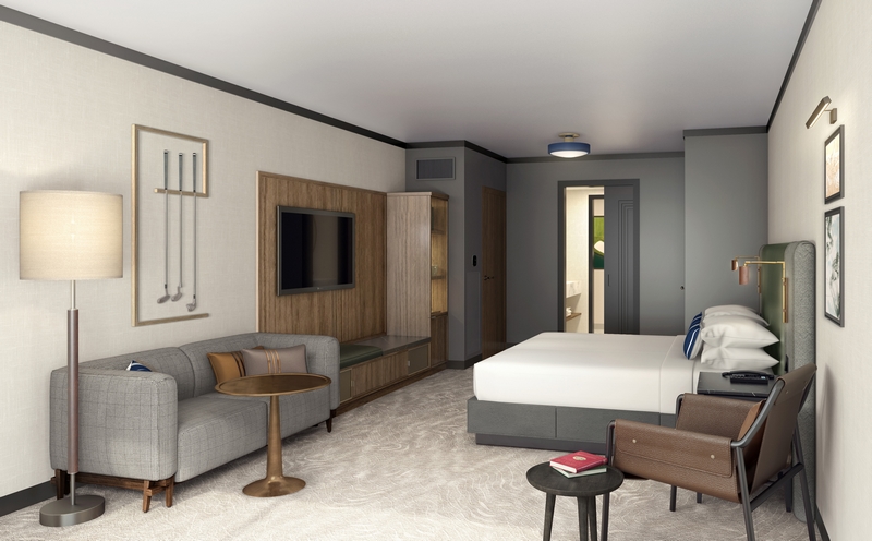and Gil Hanse, is reflected throughout the interiors from floor to ceiling windows in the lobby and many dining outlets providing uninterrupted views, to subtle design details that are a nod to classic and tailored elements of golf within the guestrooms. Whether the perforated strips of leather at headboards inspired by the broguing on a golf shoe, a leather wrapped floor lamp or leather trimmed sofas inspired by a golf bag and glove, or the carpets inspired by the topography of the PGA golf course, these nods pay homage to the location and ethos of the resort.
