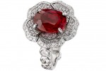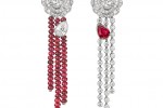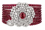 At the center of the camellia on the Rouge Incandescent necklace is a 7.61-carat Mozambique ruby, which detaches to reveal a second, red camellia, illuminating hues of rouge, encrusted with baguettecut rubies.