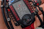 brand website. The watch can display any message requested by the owner, in the desired language, with a limited number of characters. The sapphire caseback provides an opportunity to admire the movement’s oscillating weight sculpted like a flower and set with eight precious stones (4 emeralds and 4 blue sapphires).