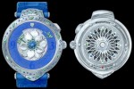 Discover the world’s most prestigious gatherings & exhibitionsChristophe Claret invites two hand engraved and green lacquered dragonflies, featuring wings enhanced by sky blue SuperLumiNova, to indicate the time. The white gold case is adorned with 59 blue sapphires and 15 marquise-cut emeralds symbolizing the leaves of the cherry tree.
