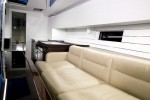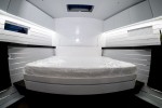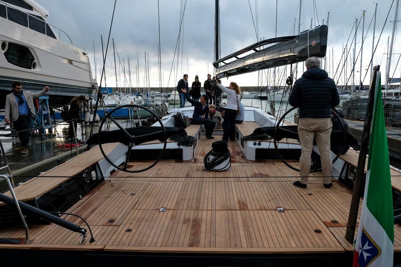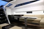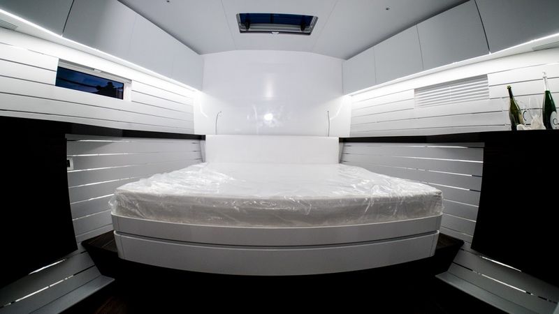 The deck is completely covered in teak, vacuum bonded. The mainsheet winch is mounted on a central column, while the primary and manoeuvring winches are arranged on the aft end of the benches, where also all the manoeuvers from the mast are reported, completely recessed below deck. The deck plan is, therefore, extremely clean and clear, also thanks to the elimination of the jib tracks, substituted by a bar- ber system for the racing jibs – while there a trasversal track for the cruising self-tacking jibs. Gennakers and other asymmetric sails can be set on the carbon fixed bowsprit, which also works as anchor arm.