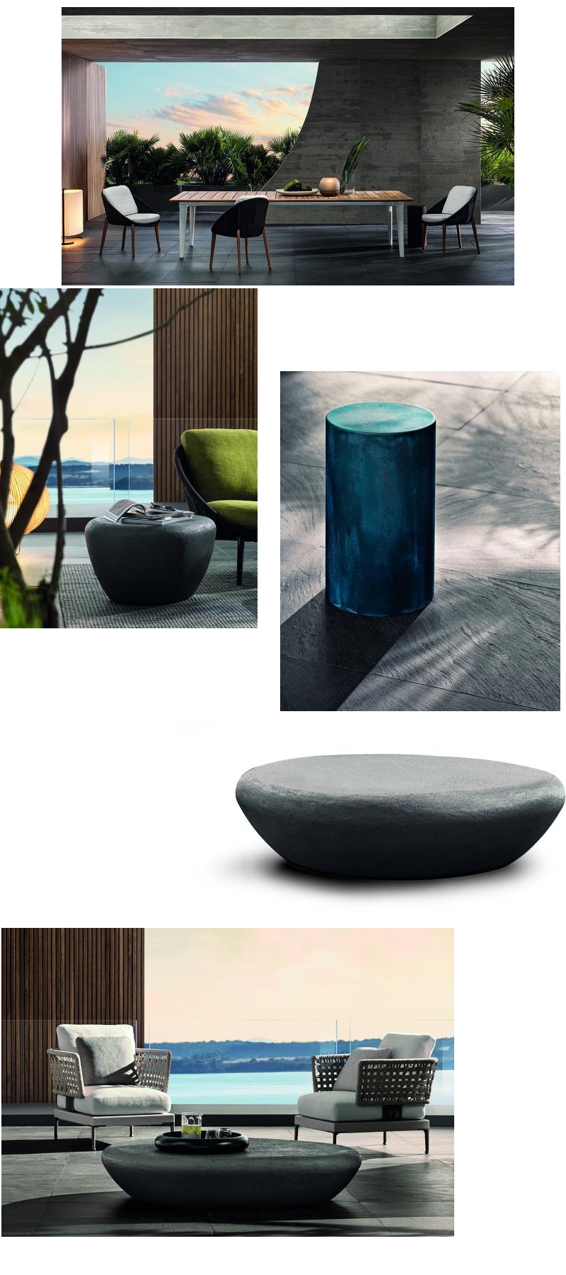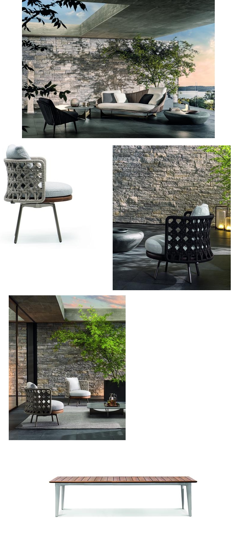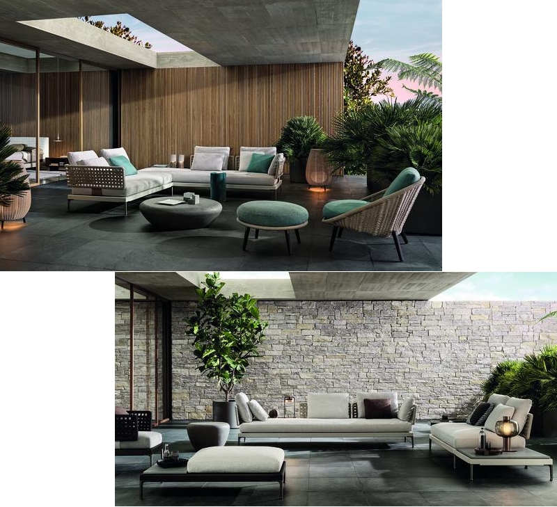 The outdoor collection is complemented by a range of occasional and coffee tables, in sculptural shapes and featuring perfect blends of natural materials, as well as rugs designed to highlight the furniture. The versatility of the collection makes it easy to use in relaxation, dining and conversation areas, in the residential and hospitality sectors, each time creating a surprising landscape that is never ordinary.