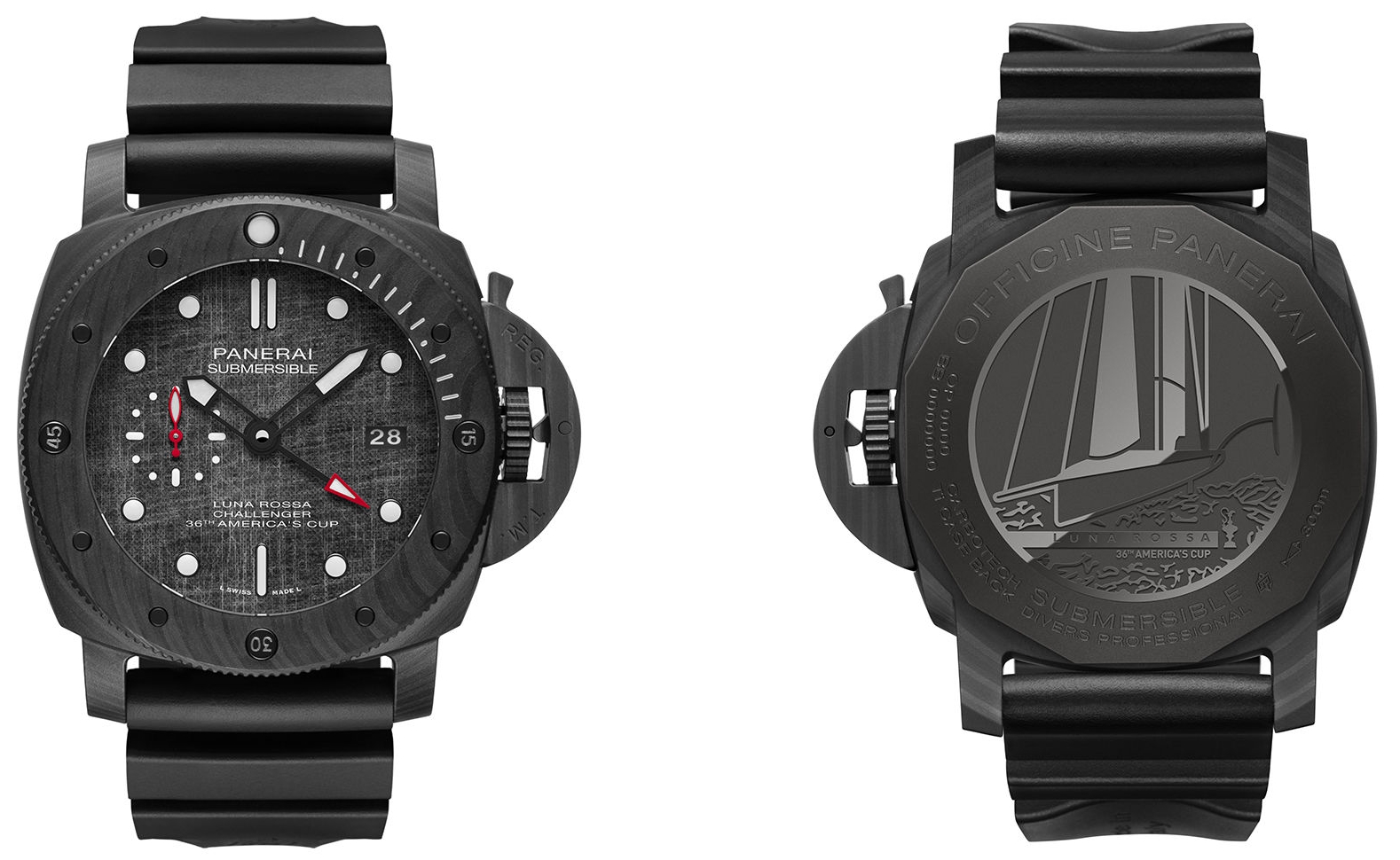 The striated matt black appearance of the case (47 mm) arises from the particular arrangement of the carbon fibres and it gives every watch a sports look, high tech and very distinctive. Enhancing the strong personality of this watch are the unidirectional rotating bezel for calculating the duration of a dive, also made of carbotech, and the dial, whose special texture conceals a fascinating secret: pieces of the sails of the Luna Rossa have been applied to it. The indications on the dial are clearly visible in all situations – including underwater – and several details stand out with their red colour: the small seconds hand at 9 o’clock and the central hand indicating the second time zone which, when set up, will enable the start time of the races of the 36th America’s Cup to be followed even if they are taking place on the other side of the world.