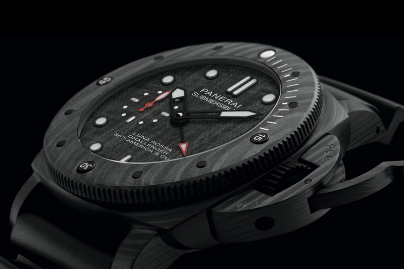 The first watch inspired by the partnership between Panerai and the Challenger of Record of the 36th America’s Cup is the Submersible Luna Rossa, a diving watch water-resistant to a depth of 300 metres (30 bar) with a case made of carbotech, the innovative material based on carbon fibre introduced into the world of high quality watchmaking by Panerai.