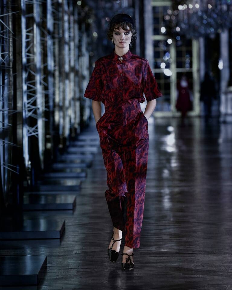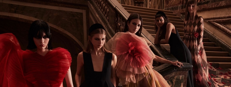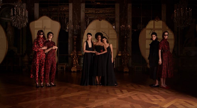 For her new Dior collection, Maria Grazia Chiuri invites us into a territory where the time-space dimension has been erased. Dior immerses us into a dreamlike world straight from fairy tales, and the Hall of Mirrors in the Château de Versailles provides the perfect backdrop. The designer revisits iconic Dior codes with essential black, permeated by a through line of red, setting the theme for the season. Colorful evening gowns seem to evaporate in marvelous colors, transforming women into modern-day princesses while recalling the world of childhood with plastrons in broderie anglaise.
