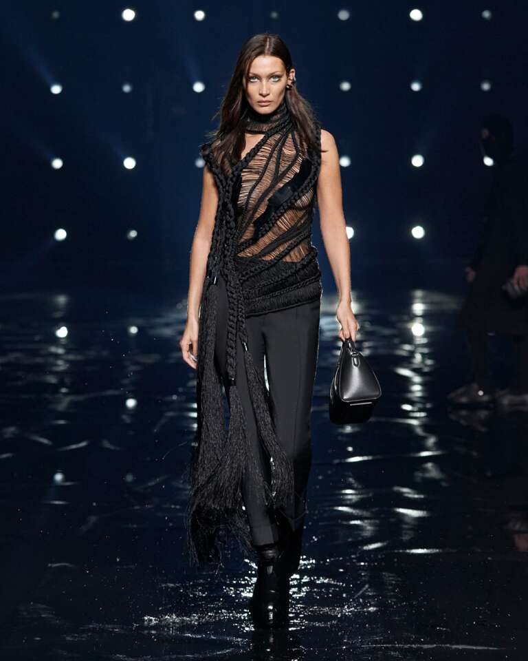 Givenchy Fall Winter 2021/2022 collection by designer Matthew Williams, who became Givenchy creative director during the health crisis, reflects the intensity of the past year. A mix of lavishness and austerity, the silhouettes are about a constant tension between two worlds. Micro and macro lines contrast extravagance and taut cropping, and an architectural approach to tailoring, creating an urban style with materials that envelop and cocoon, emphasizing freedom of movement and the liberation of the body.