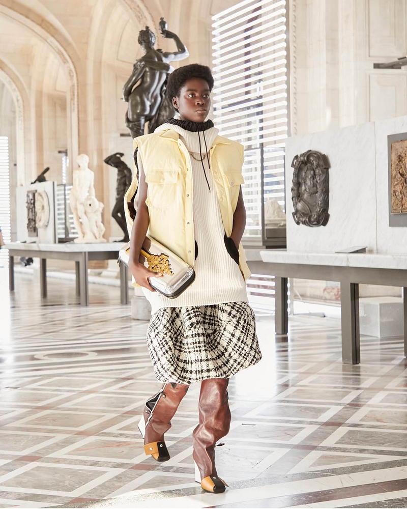 With an empty Louvre providing a stunning set, Louis Vuitton”s Nicolas Ghesquière presented a Women’s Fall-Winter 2021/2022 collection teeming with life. The Fall Winter 2021/2022 collection features a collaboration with Italian design atelier Fornasetti. Nicolas Ghesquière created a liberating and bold collection, incorporating Fornasetti’s distinctive visual world. Colorful silhouettes playing with volumes were matched with antique motifs drawn by Fornasetti, a subtle blend of timeless modernity and history.