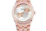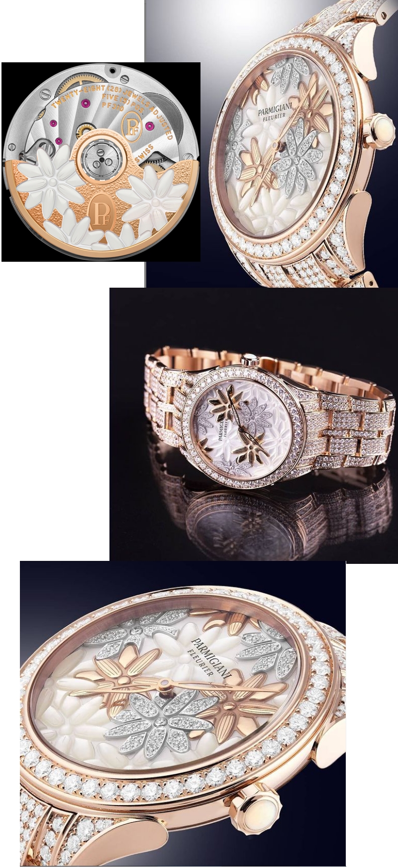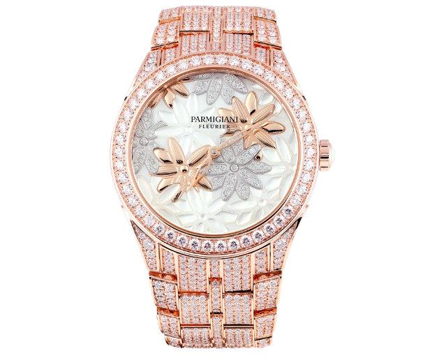 The Parmigiani Fleurier Tonda Reine de Mai in 36mm rose gold case features a crown with a white opal cabochon; it is polished and set with 70 diamonds totaling 2.09 carats, while the bracelet is meticulously set with 906 diamonds totaling 9.22 carats. The bracelet is beautifully integrated to the case thanks to its teardrop- shaped lugs, a Parmigiani Fleurier trademark, and was carefully designed to ensure great comfort.