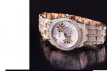 The six mother-of-pearl flowers on the dials of the (€ 109’000) Tonda Reine de Mai watch are particularly challenging to decorate, as the material is quite delicate and fragile. The base of each flower is sandblasted by hand; then, each petal is polished and engraved by expert artisan hands resulting in varied matte and polished finishing that give more depth and dimension.