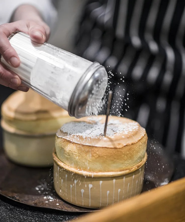 Aurélie Collomb-Clerc, Flocons de Sel (Megève) – Hot soufflé flavored with gentian root, lime zest and gentian crème anglaise.