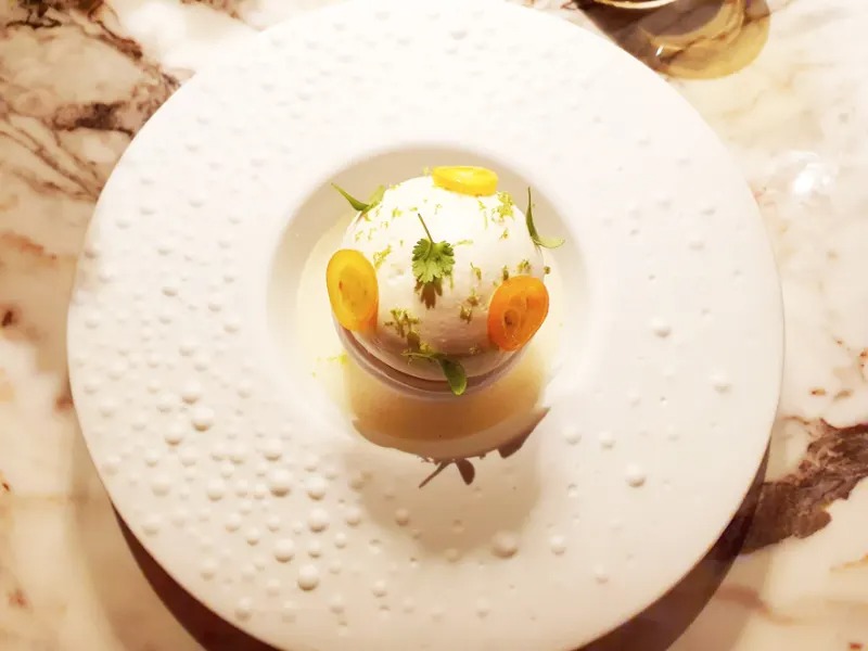 François Josse, Rouge (Nîmes) – Crispy meringue, citrus and fresh herbs.