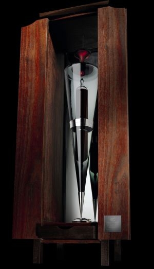 Nick Mount (Glass Sculpture Artist), Henrick Forster (Silversmith), Andrew Bartlett (Furniture craftsman) & Ray Leake (Scientific Glass Blower) have committed hours of time and years of experience to bring a distinctive objet d’art, a hand-blown glass “ampoule” with one of the most expensive Australian wines released in this unique format. The high-priced vintage can only be opened by a specially-trained wine expert.