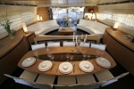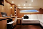 The cockpit with a vast covered area made possible by the use of lateral carbon fiber fittings is the starring attraction with a teak table featuring seating for ten, a fully equipped bar, a large solarium and, a first for this series, a 32” in-built TV located on the ceiling. The new model also features a touchscreen audio visual system that also controls the lighting, curtains, air conditioning and closed-circuit video camera system.