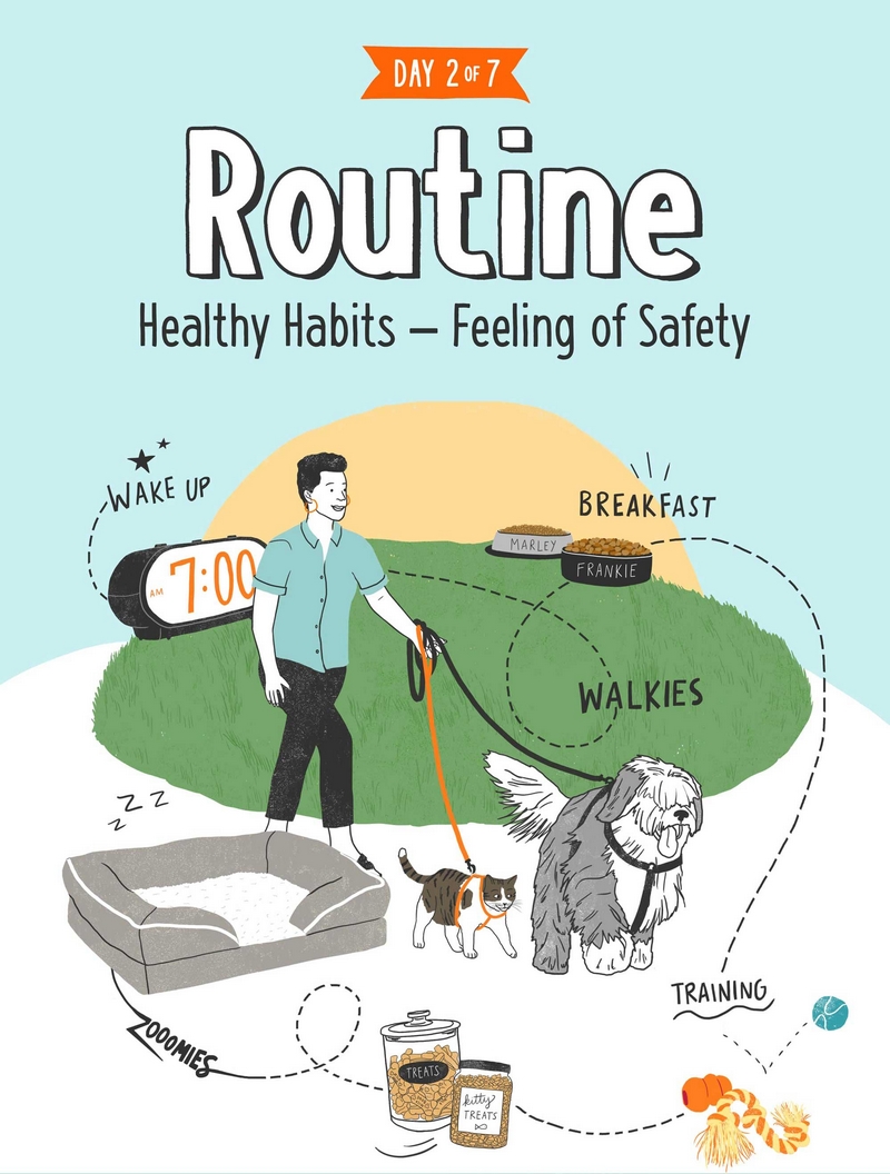 Whether it’s sleeping, eating, potty time, or exercising – establishing a routine for your pet’s day helps them feel comfortable and safe.