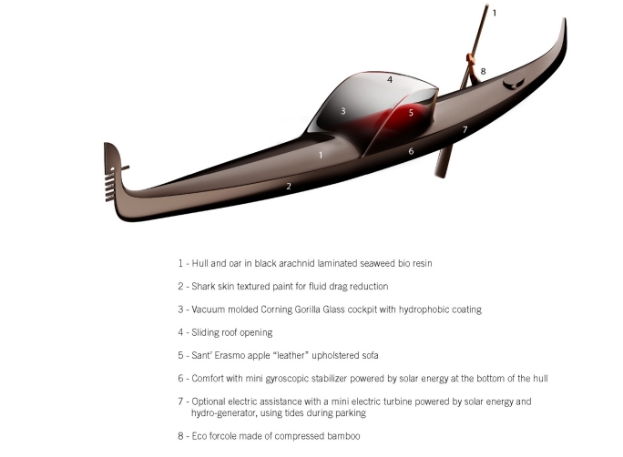 “The experience will be unique as it shall reflect the elegance of intelligence. Every material here serves a purpose. I have used ecological materials such as arachnid because it is the strongest as well as the lightest material on earth. This can help the gondolier in the practice of his art. The bio resin made of seaweed is the link for the arachnid.” – Starck told Forbes in an interview.