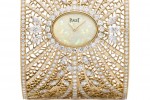 In true Piaget style, a new High Jewellery cuff watch was introduced at SIHH 2017. Artist Sara Bran worked on pink gold like lace around an oval-shaped white opal dial at the centre.