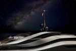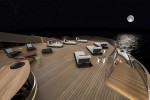 The boat’s shape is harmonious and dynamic at the same time thanks to the elegant helical bands that characterize the superstructures linking the bridges. The upper band, for example, frames the bridge and then goes downstairs, harmoniously joining the owner’s deck, creating a lavish scenic effect that integrates the outer connecting staircases to the upper deck, where Eli-Deck is expected.