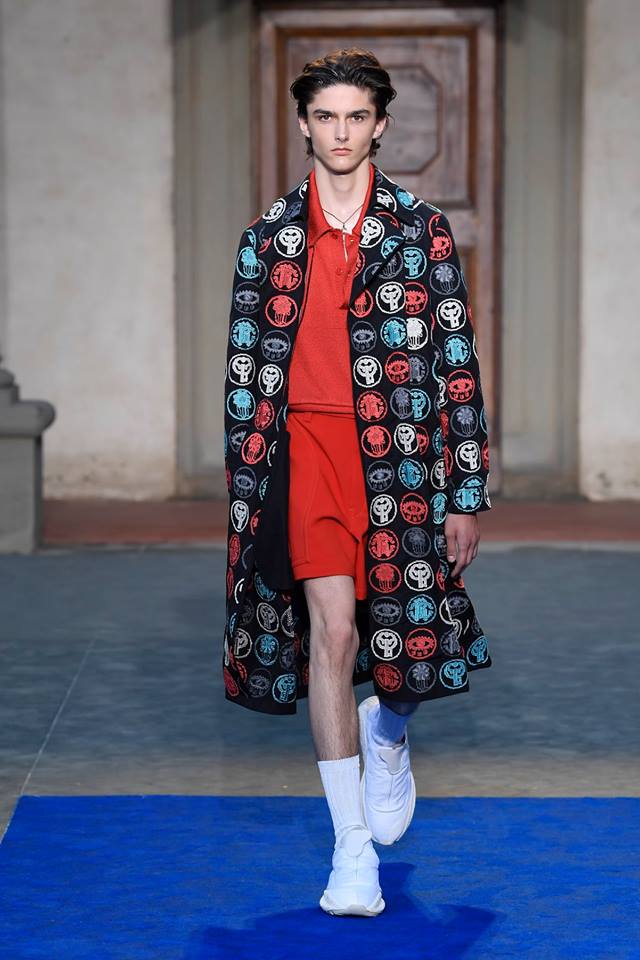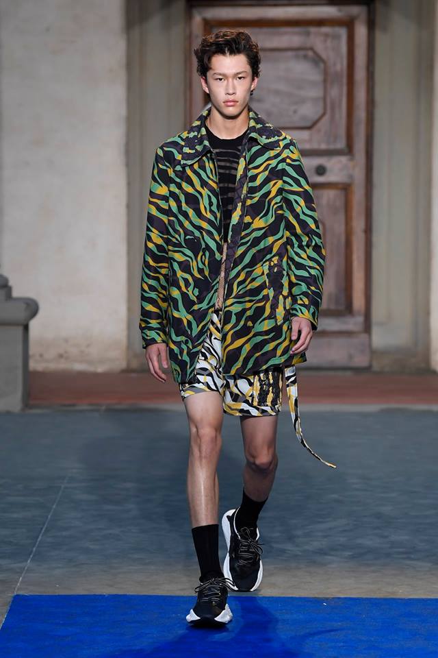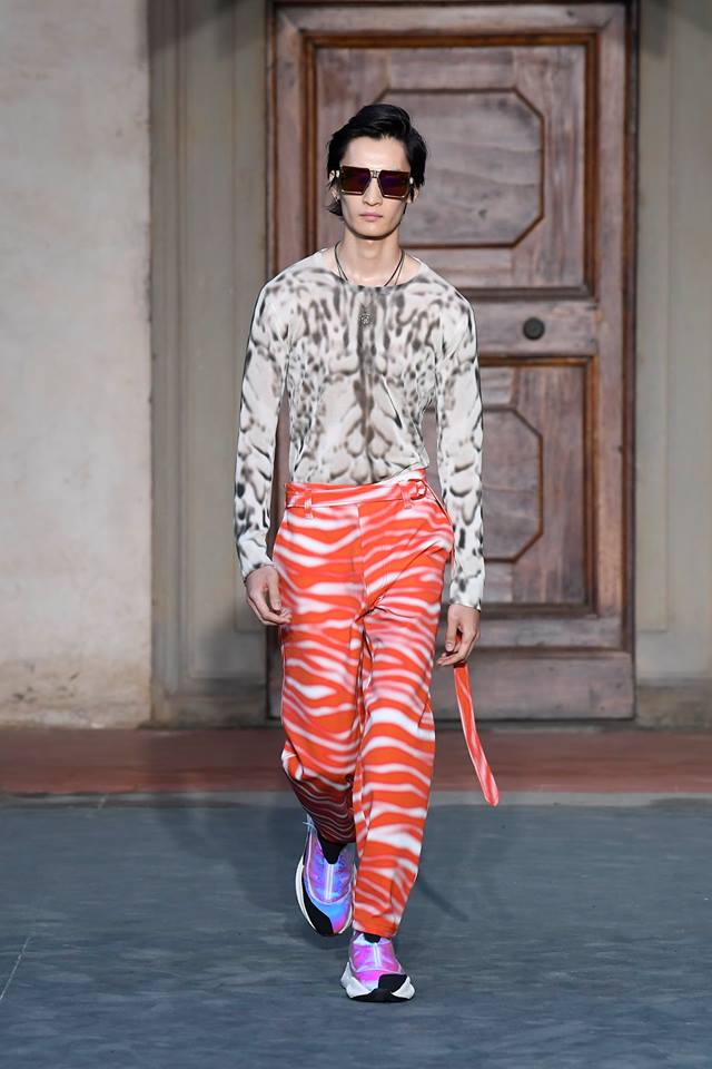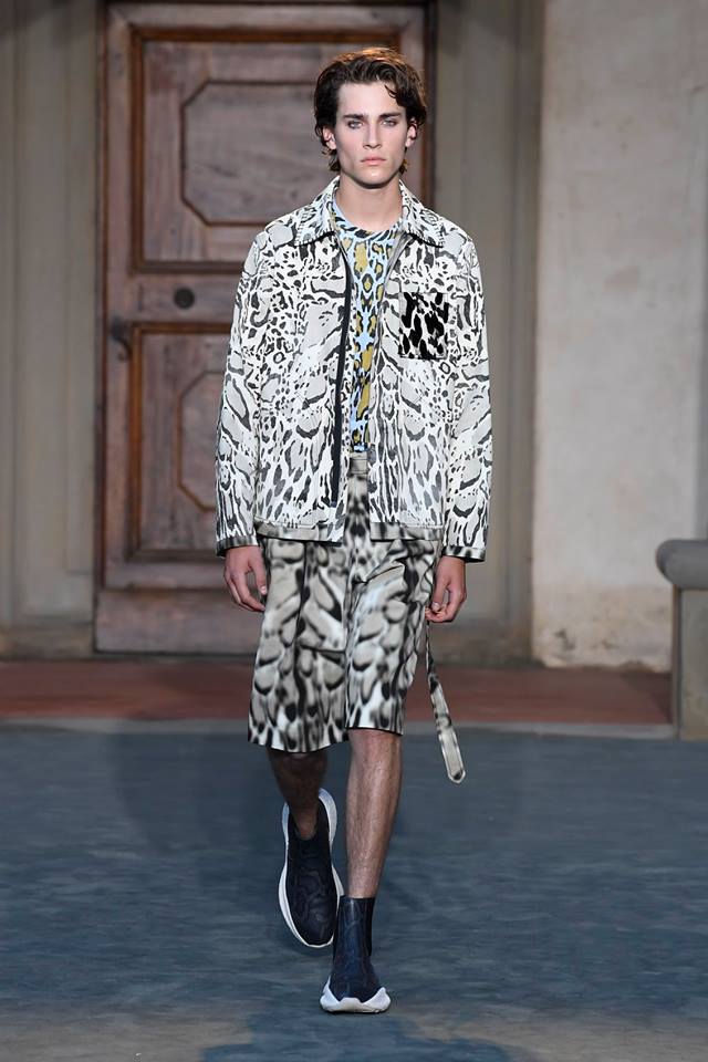 Pitti Uomo 2018: Roberto Cavalli presents first men’s collection by Paul Surridge. With an airy, relaxed and confident spirit, the collection is a journey through the abstractions of animalier. Animal motifs are sliced, clashed, hybridized into new species.