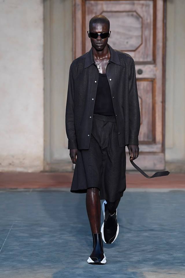 “The energy of immediacy pervades the collection. Function and proportion are main preoccupations. The vocabulary is compact and effective. Ease as the ultimate swagger, with eye-shielding visors and polymath running shoes – speeding at a futurist pace. Chains at the neck underline the assertive cockiness,” commented Roberto Cavalli on the Spring-Summer 2019 collection for men.