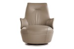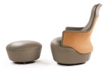 The armchair swivels 360° and automatically returns to its starting position. The upholstery is in Cuoio Saddle Extra leather for the external shell and Pelle Frau leather for the internal surface and seat. The rim of the Cuoio Saddle Extra leather surface is embellished with elegant visible contrast stitching. The base of armchair, footrest and sidetable is formed of an aluminium coloured painted steel plate. The sidetable structure has a single steel pedestal with moulded profile.