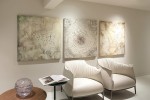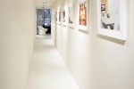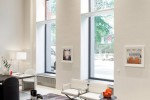 Distinctive features of the Poltrona Frau showrooms across the globe are present in the Cologne space: neutral shades of magnolia, a large musk wall, minimalist graphic elements for the furniture, narrow windows looking out onto the street, and little paintings that describe the collection of chairs for the office and the home.