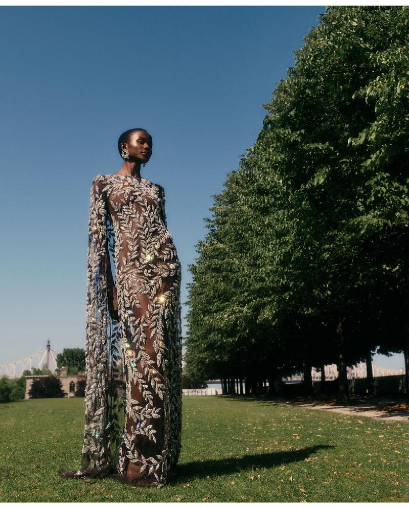 The collection’s evening gowns are a vision of opulence, as crystal vine embroidery delicately wraps around black and nude tulle, evoking the glistening leaves that emerge after the first rainfall of spring. Each gown exudes a sense of ethereal beauty, capturing the essence of nature’s rejuvenation.