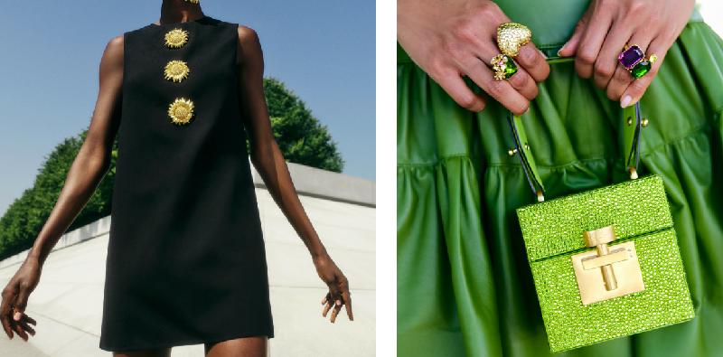 The jewelry selection is equally captivating, as it elevates the floral motifs and embraces hand-painted resin. The pieces make a bold statement, gilding the wearer with a sense of opulence and femininity. What sets this collection apart is the brand’s unique approach to scale, presenting an über-forward and feminine consideration. The jewelry pieces strike the perfect balance, adding a touch of sophistication and completing the overall ensemble.