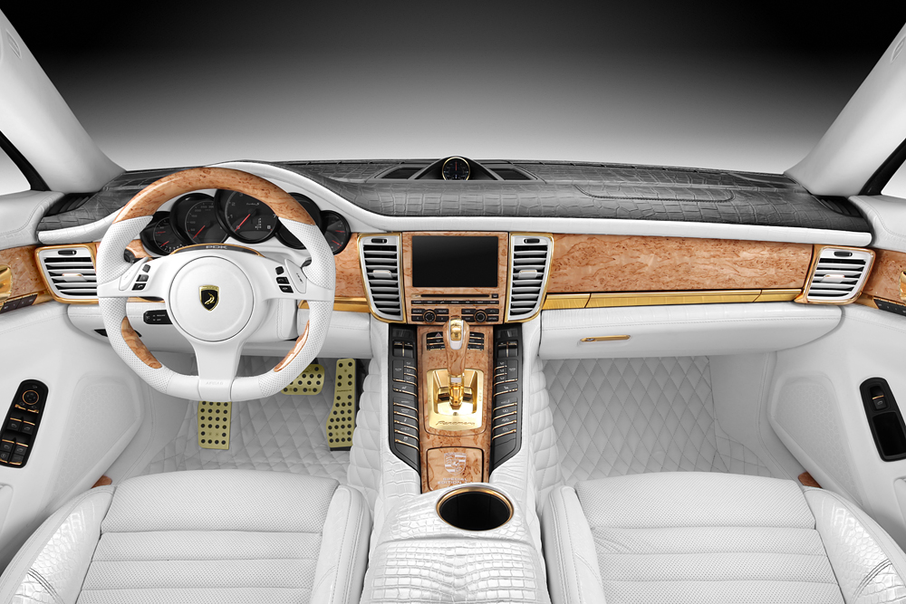 That’s the reason why you can’t call the Porsche Panamera Stingray GTR a classic aerodynamic body kit. It is essential to highlight that the car has become much wider. Extended wings, advanced air vents, sharp outlines of blade front bumper and bonnet, strongly-marked rear diffuser and spoiler on the boot lid, all this created absolutely new aggressive style. Rear doors and wings are visually combined. Now, to open the back door, you need to press a small button and the door opens automatically. All the new bodywork components are made from carbon fiber and Kevlar.